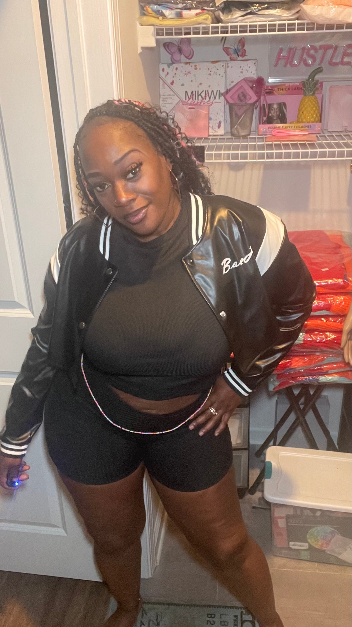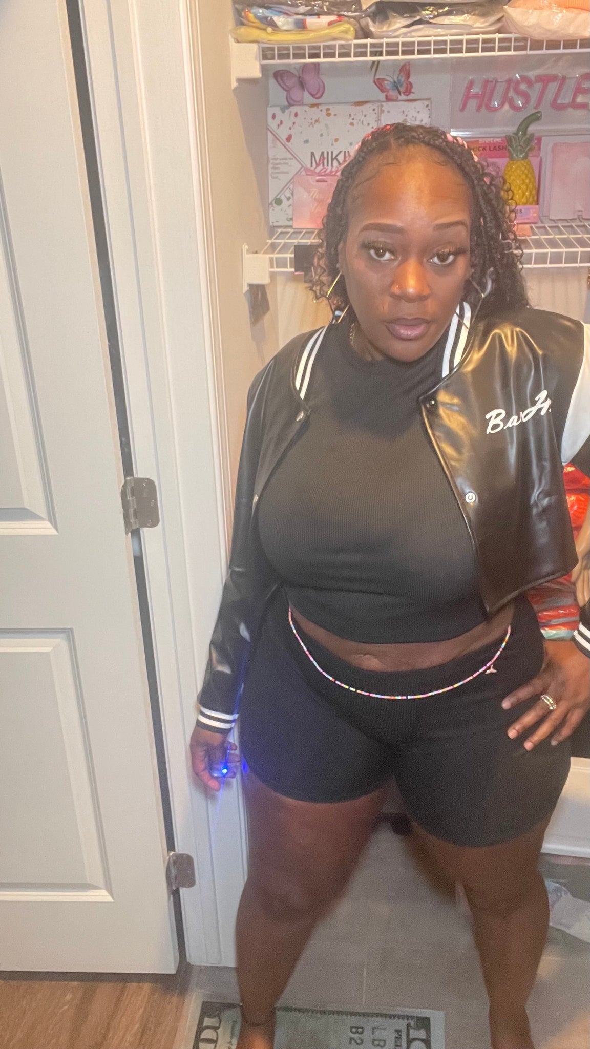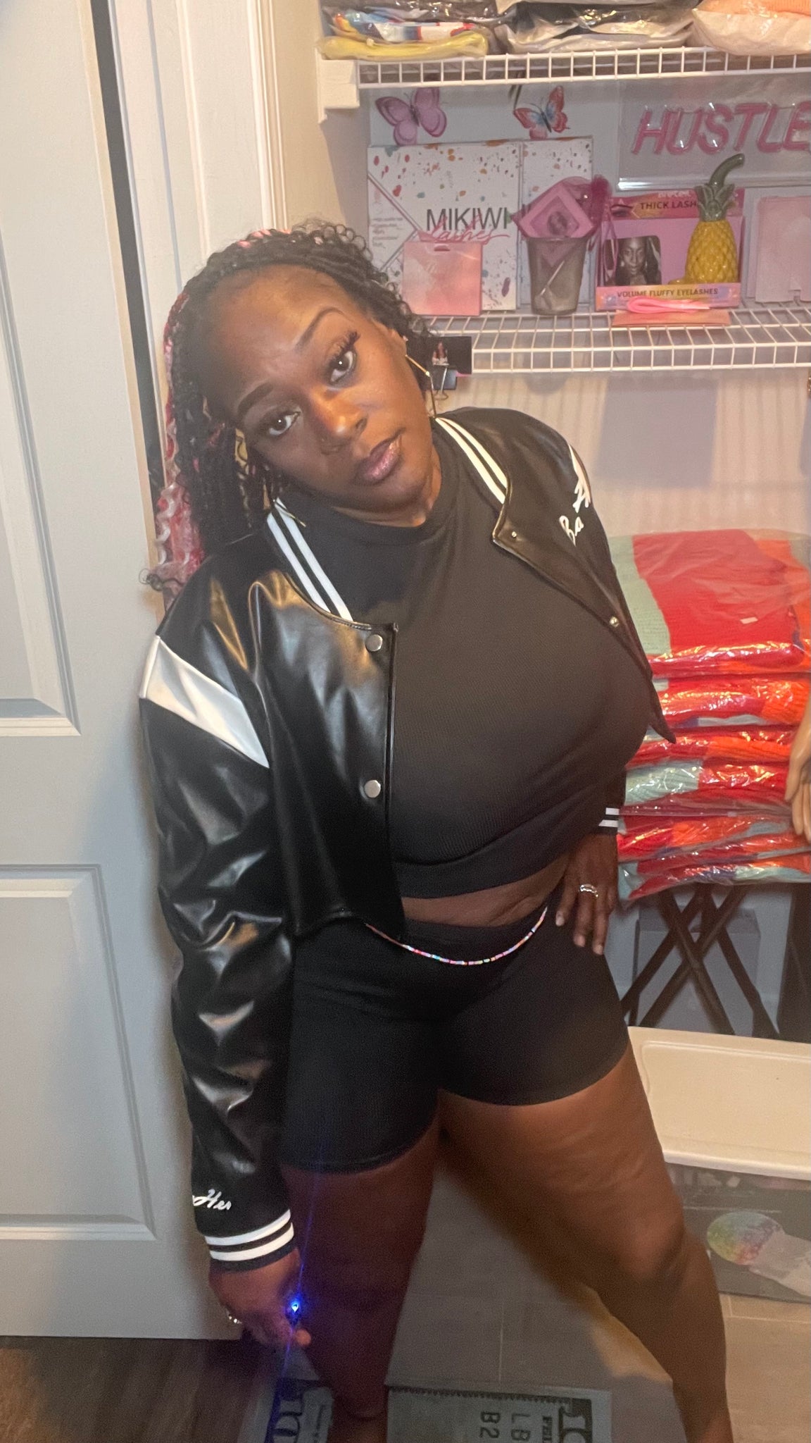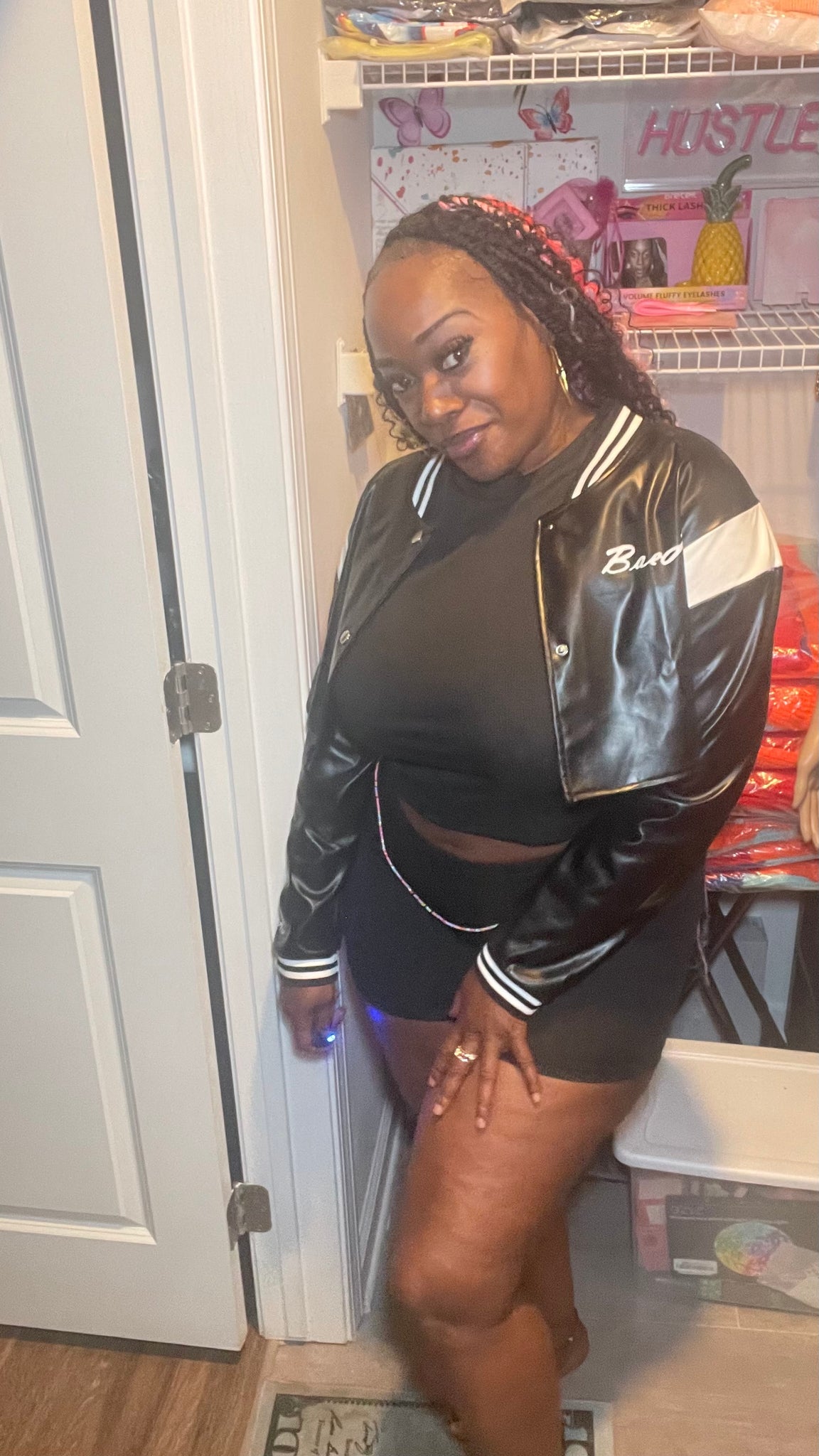 The BaeLash Crop Leather is a versatile jacket made of leather that can be dressed up or down for a stylish look on a cool spring or summer evening. The black and white color scheme adds a touch of sophistication to any outfit.